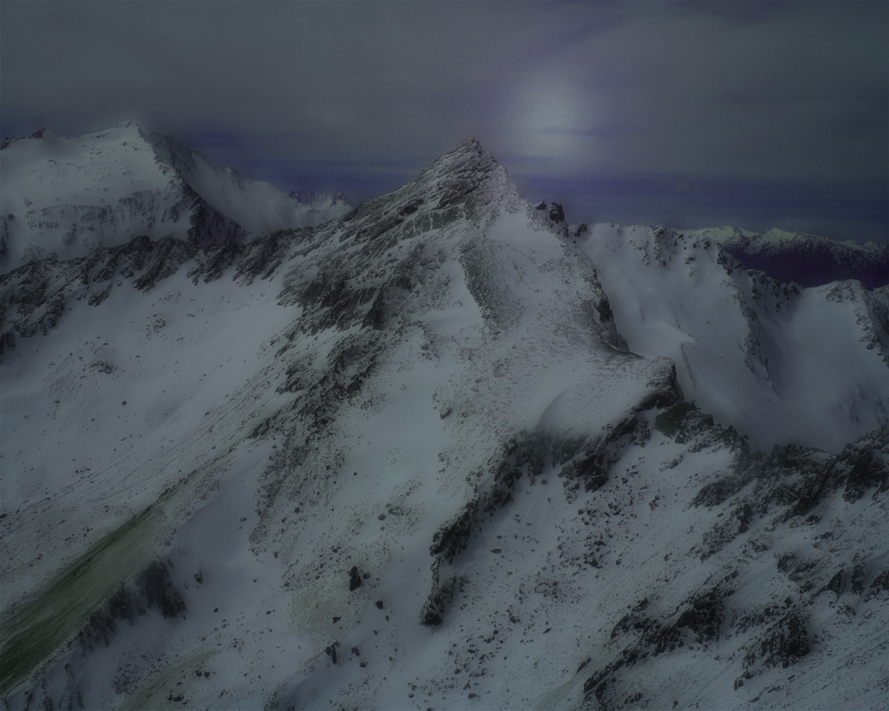 雪に覆われた山を繊細かつ神秘的に描きました。青い日の沈む雪山は誰の侵入をも阻む荘厳な雰囲気。
